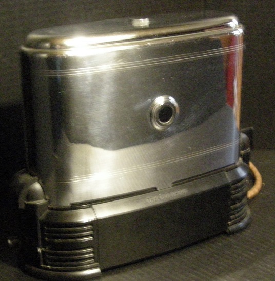 | Vintage Toaster. This was cutting edge technology in its day, sometimes called the 'walking toaster' because it has a little conveyor belt that carries the bread past the heating element. Put the bread in one end, it pops out the other end perfectly toasted and ready to eat! It practically climbs onto your plate. Toast-o-lators were manufactured from 1936 through around 1952. This one is in particularly good condition. Personally I don't like using vintage electronics, but we always try to get fully functional units because they were generally better kept, and some people do like to use them. As always we recommend that you have it checked before you plug it in. Although I wouldn't recommend actually using it, the inner workings are intact and functioning. The chrome is very good, no visible rust or dents. The bakelite feet and handles are also intact, and overall it's a very attractive piece. |